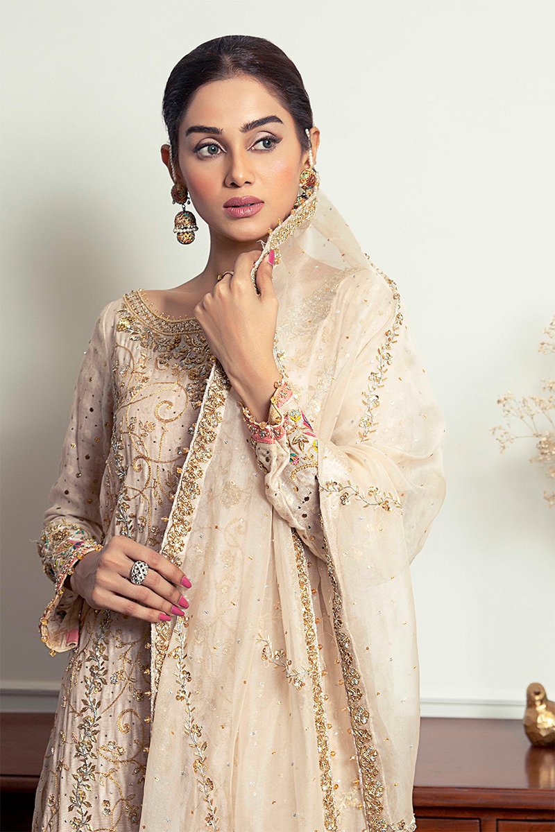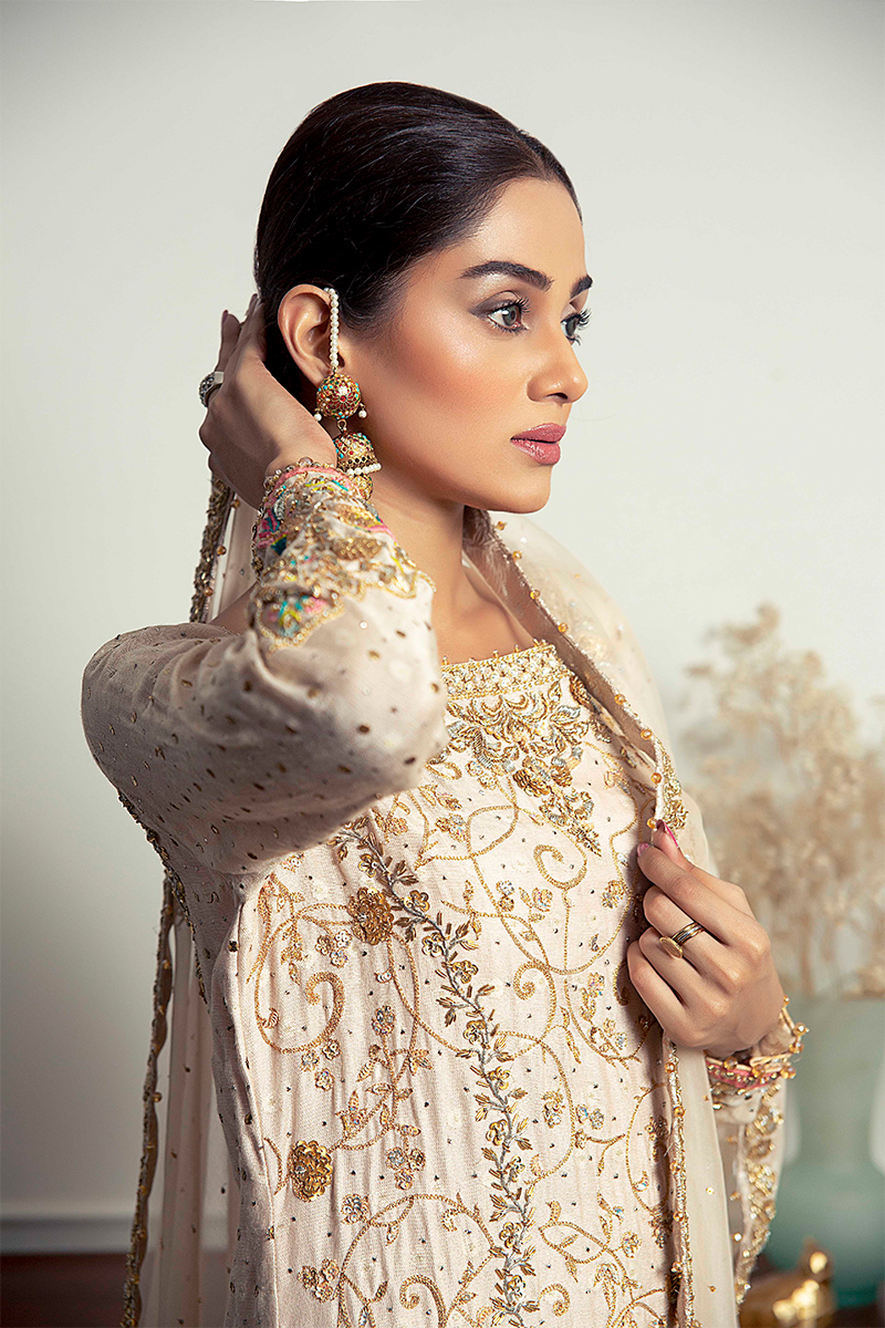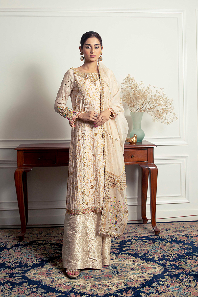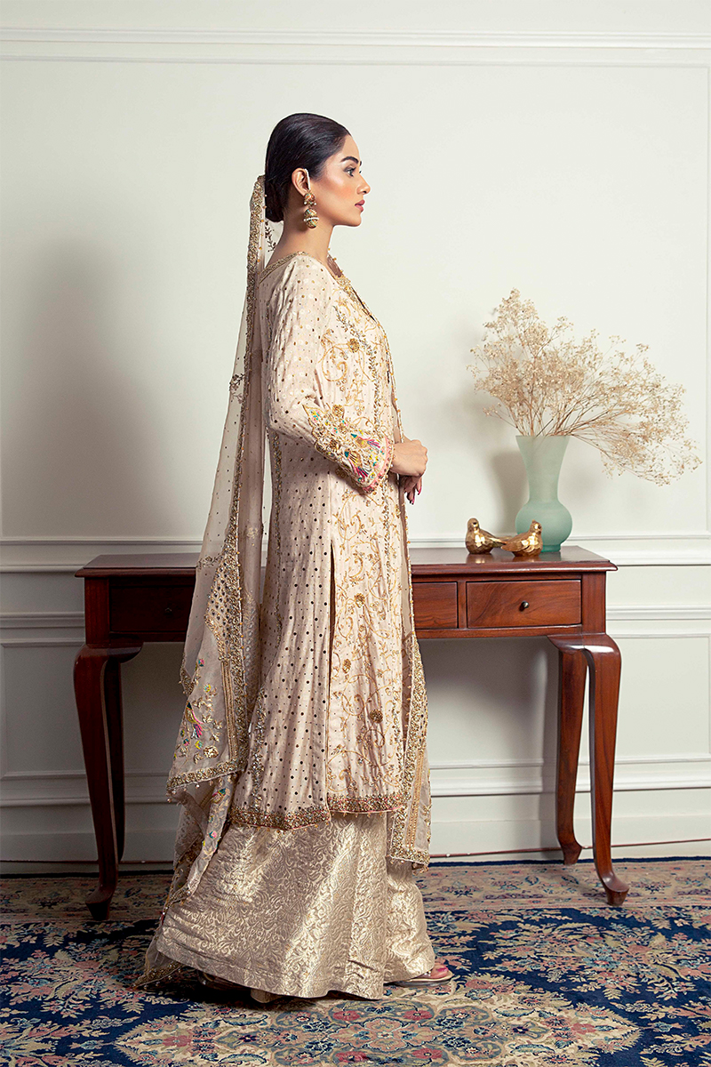 vory classic cotton net shirt adorned with traditional aari and zardozi embroidery. Front is fully hand worked with a delicate neckline. Sleeves have a bird motif made with resham and zardozi . Back has neckline and worked lines on princess cut panel. Hand worked organza dupatta featuring bird motif embroidery in a traditional Mughal style Mairab design, on the pallu, floral bail on all 4 sides. Center has lines and motifs. Kaamdani on shirt and dupatta. Paired with jamawar dhaka, lower can be customised according to the event. It is an exquisite choice for a summer Nikah or engagement ceremony.