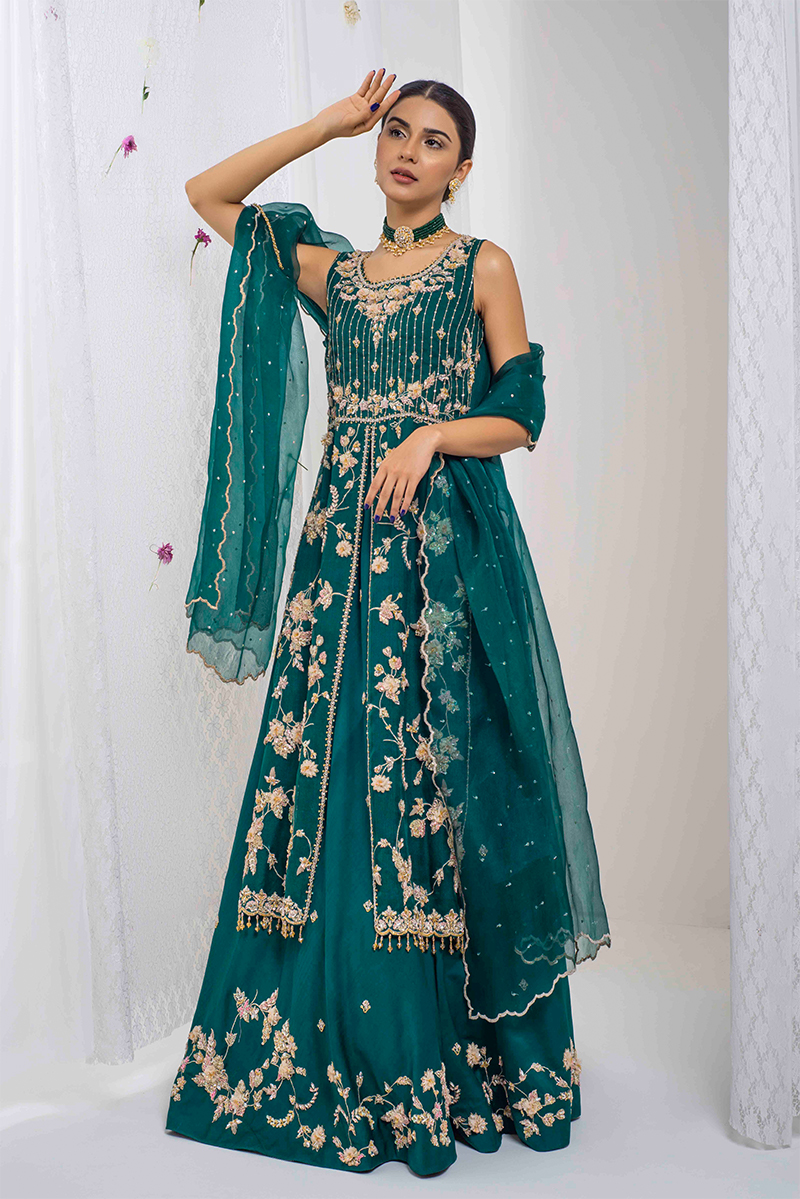 Emerald green silk lehnga with organza shirt and dupatta. Lehnga hemline has floral vines going all around with delicate embroidery in silver and pastel pink. Shirt has an empire line with detailed edging on neckline. Shirt front panels have vines going upwards. Front and back hemline have worked border. Sleeves can be added on request.
