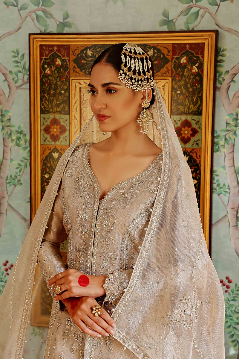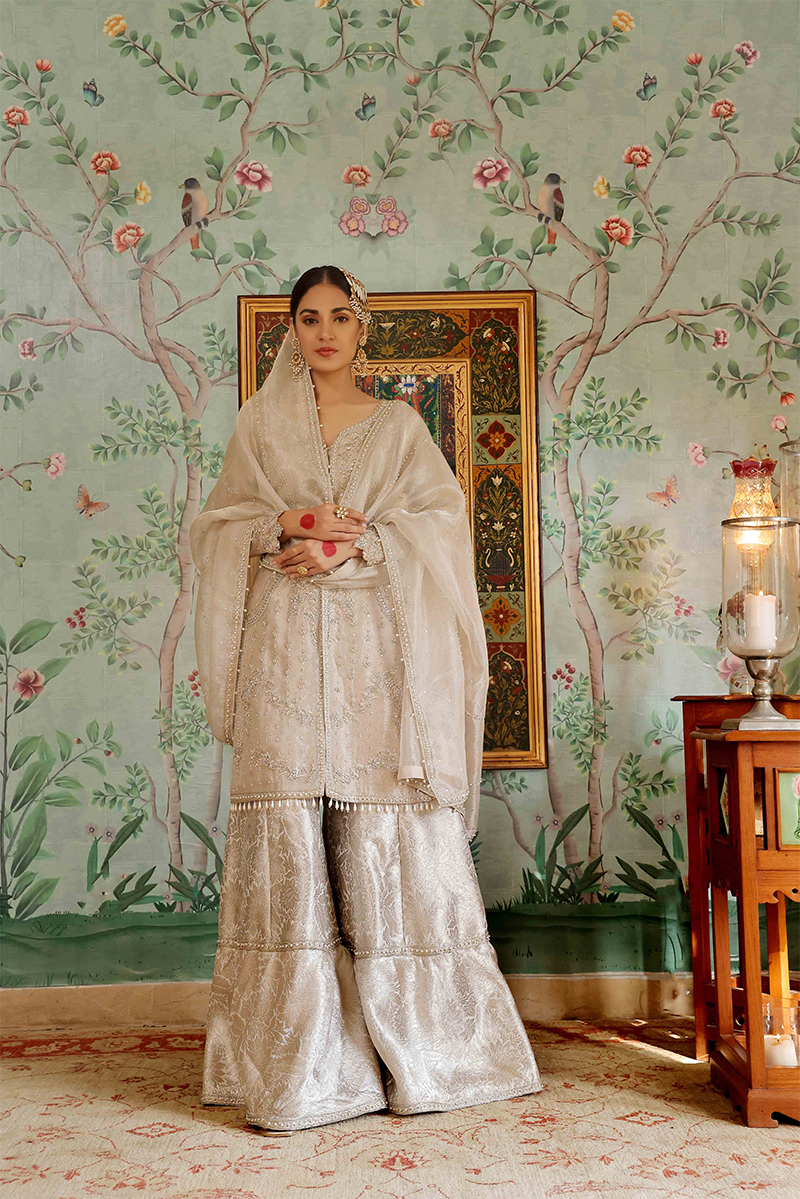 This shirt is embellished with intricate threadwork embroidery, aari work, kora dabka, sequences, beads and stones. The gharara is a traditional cut further embellished with aari work at the bottom and goth. The silver dupatta is the perfect finishing touch, featuring a variety of booti chan spray and borders with motif details. This ensemble carries the charm of bygone days and old world grace. Perfect for a small Nikah or Engagement occasion.