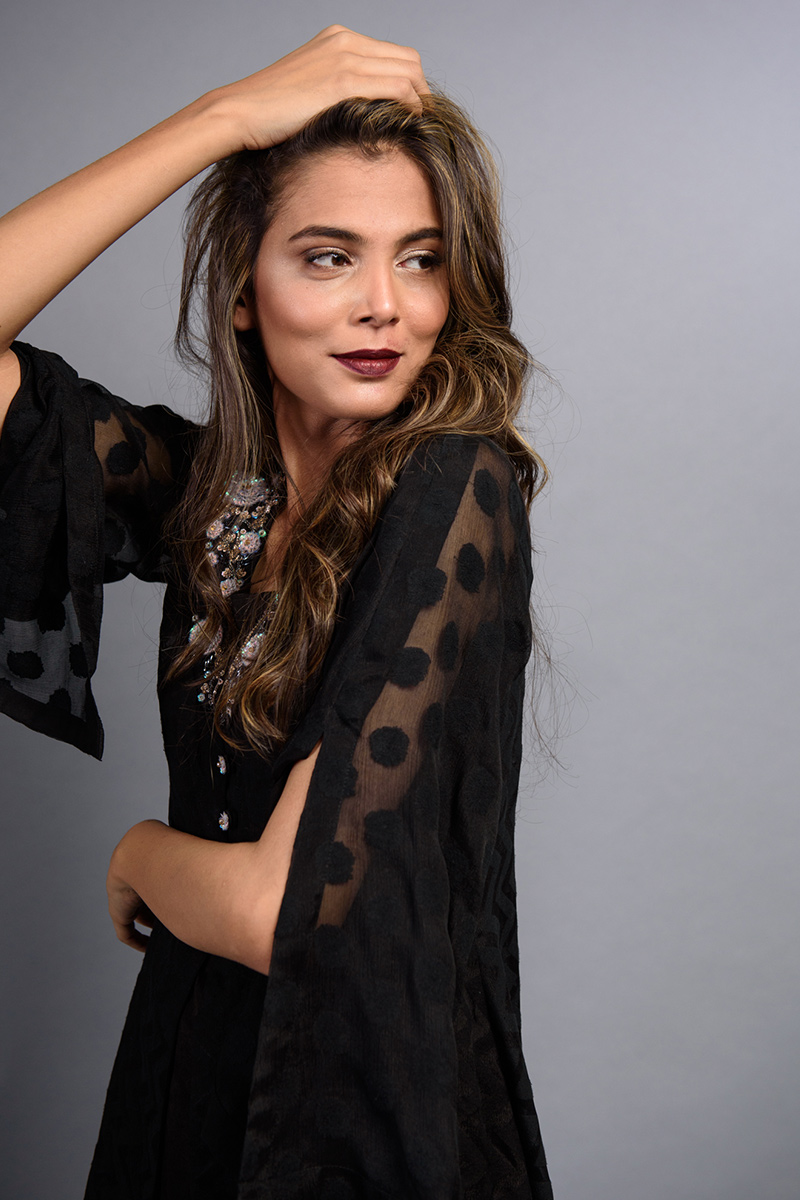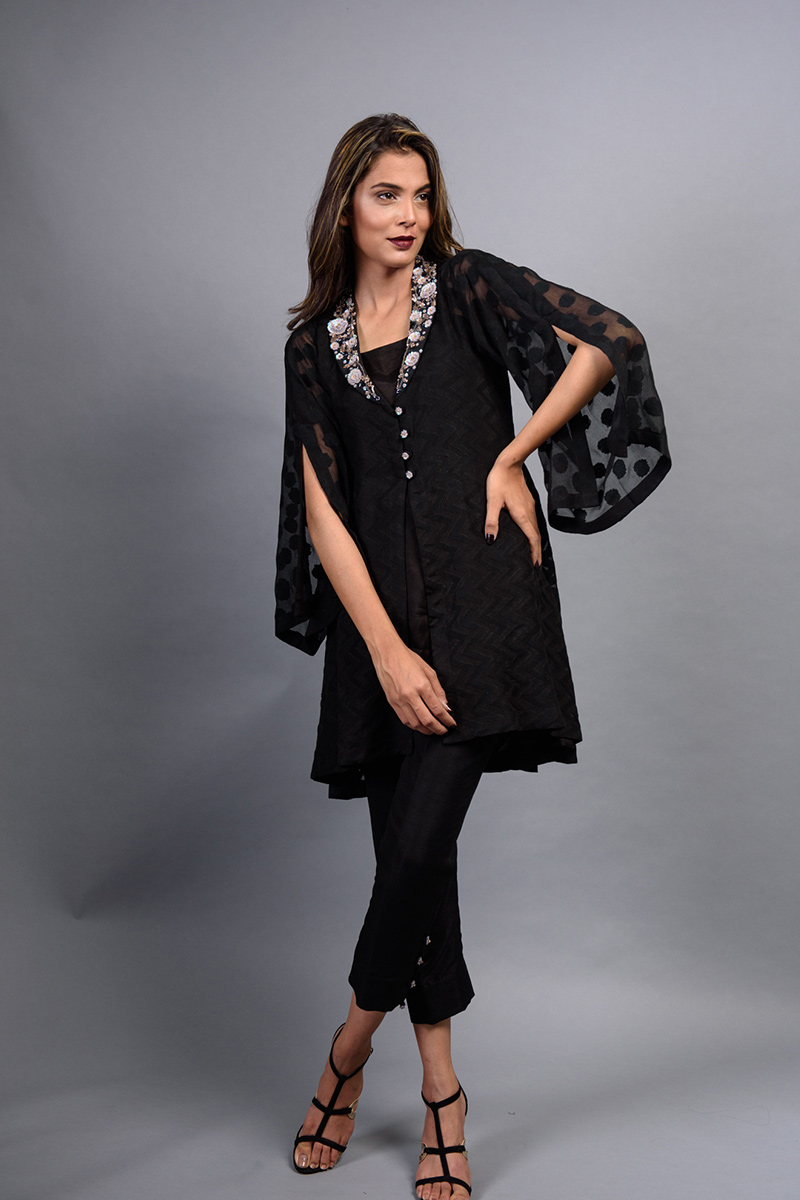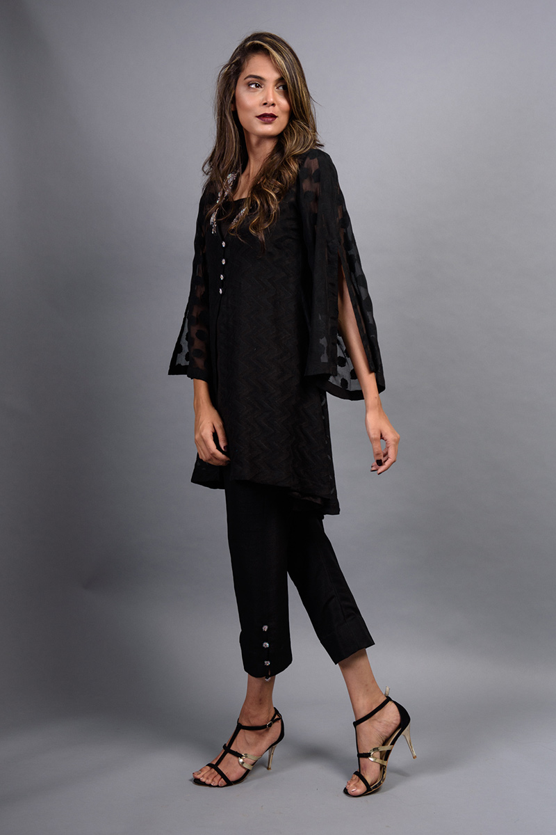 Onyx black pure khaddi chiffon front open A line shirt. Length 36.