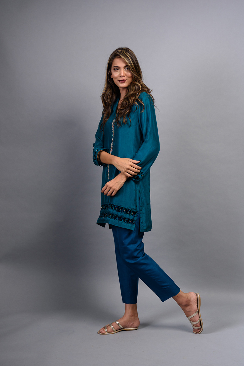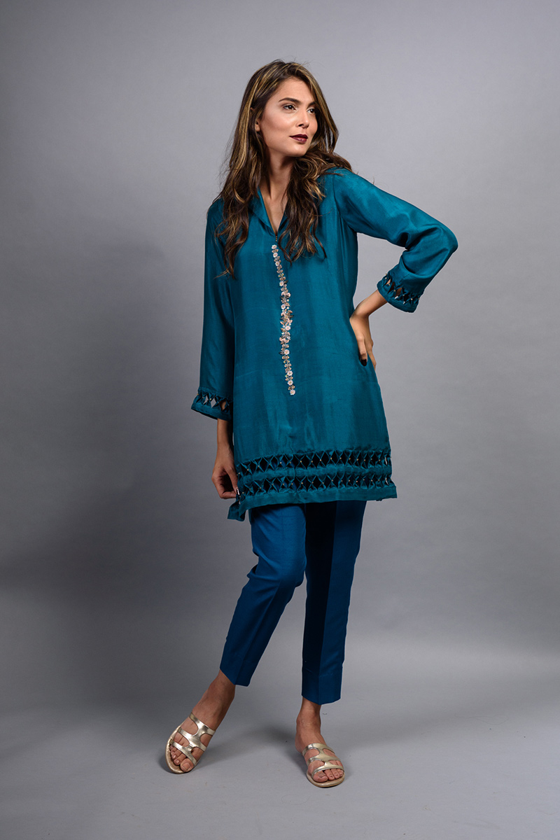 Fabric manipulation done on sleeves and shirt hemline. Shirt front embellished using sequin and beads.