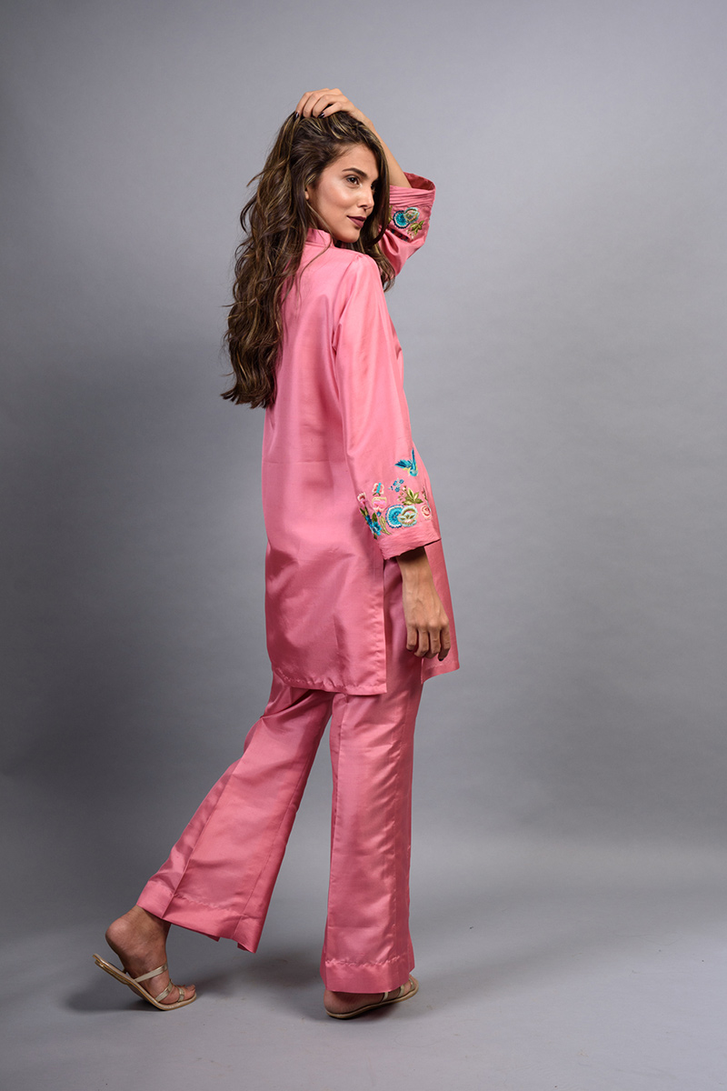 Sleeves kurta style with colorful embroidery. Sleeves and hemline with pleats.