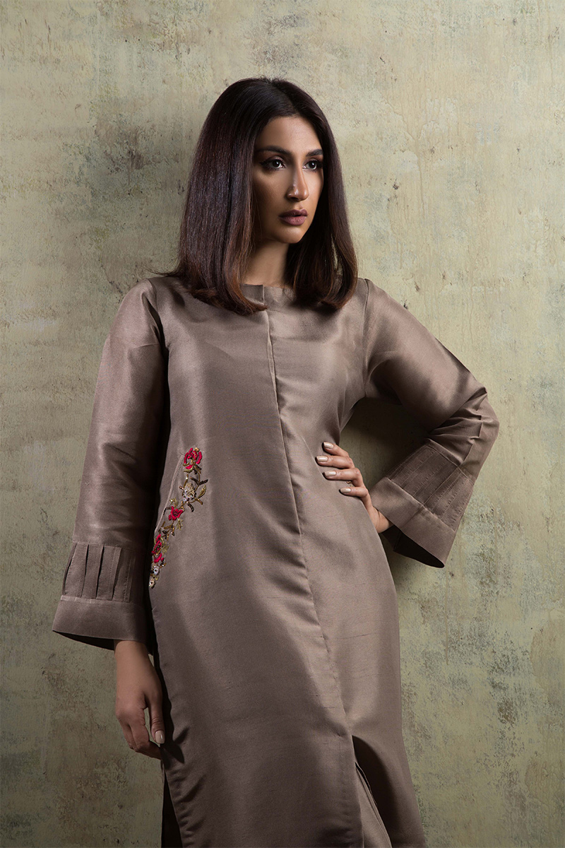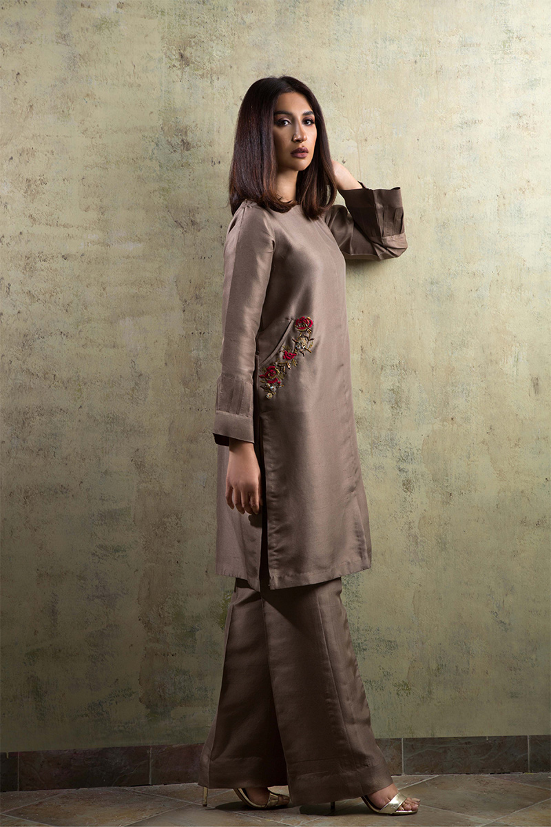 Taupe tunic style shirt. Made in pure Raw silk. Hand work done on pockets with resham and zardozi. Shirt length is 36 inches.