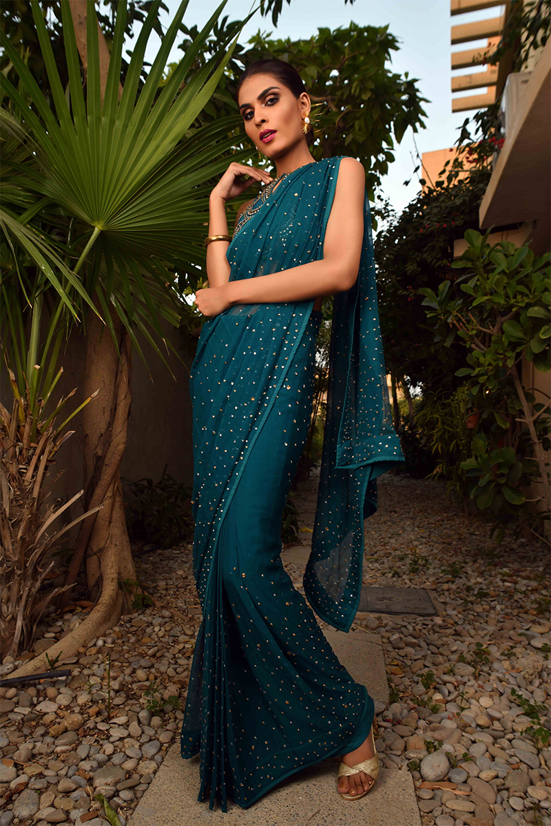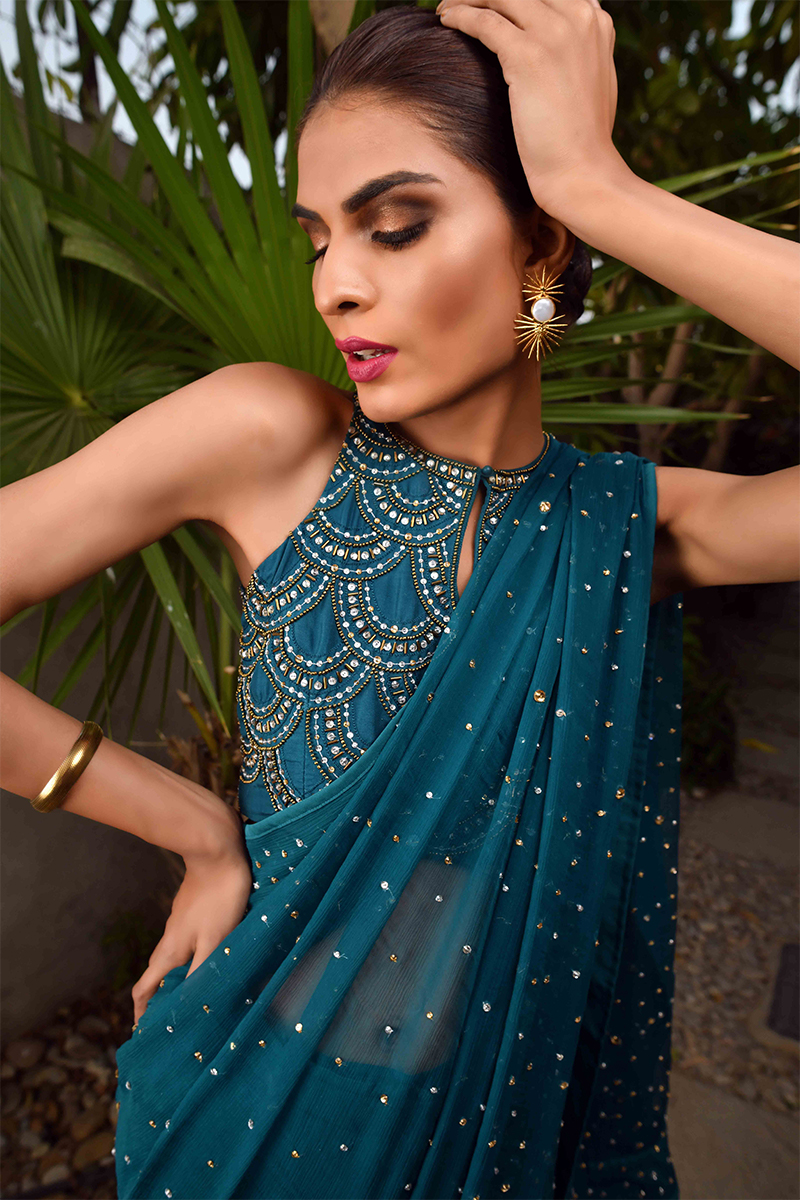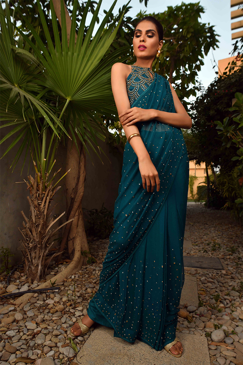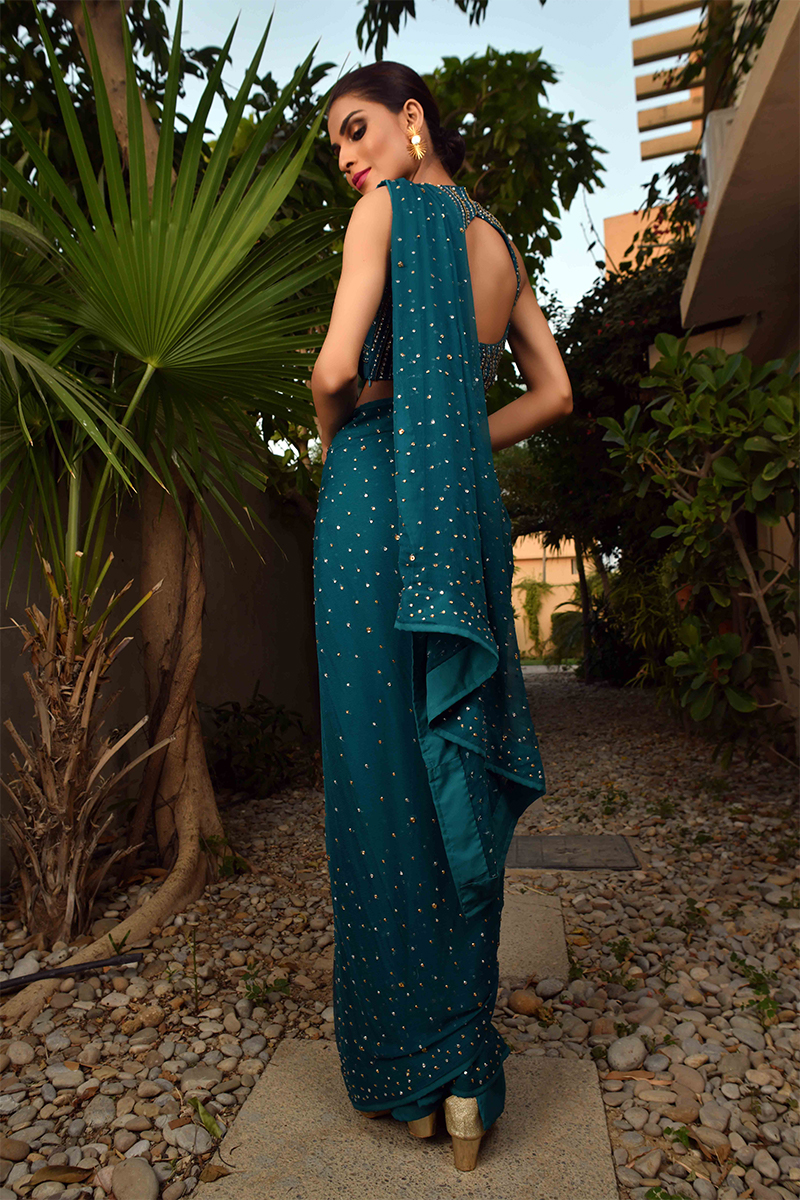 Teal blue chiffon saree and blouse