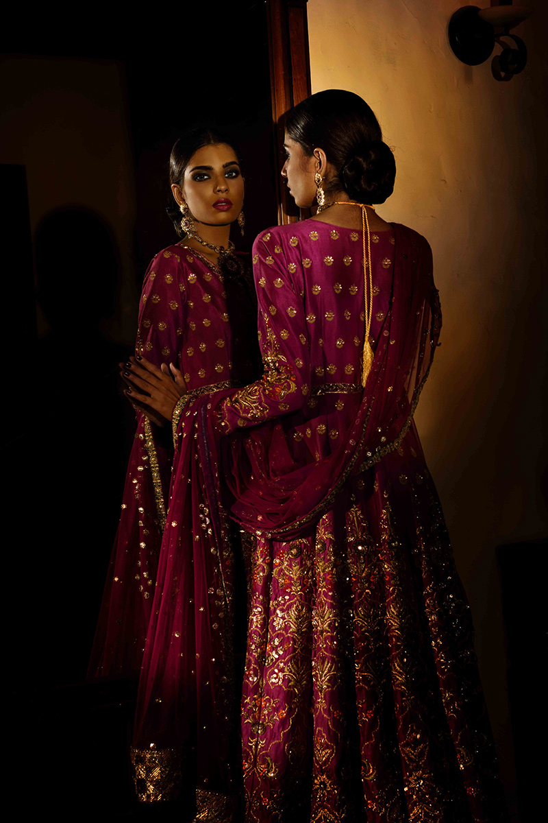 This gown is truly a work of art, with its intricate threadwork embroidery, aari work, kora dabka, sequences, beads and tilla work. The gown embellished with motifs in each panel coming up to empire line. Yoke is fully worked with small motifs. The gharara is a traditional cut. Outfit is a fusion a contemporary gown worn over a traditional cut gharara. The Magenta dupatta is the perfect finishing touch, featuring a variety of booti chan spray and gota detailing borders. This gown is for the modern Bride who wants to wear something different.