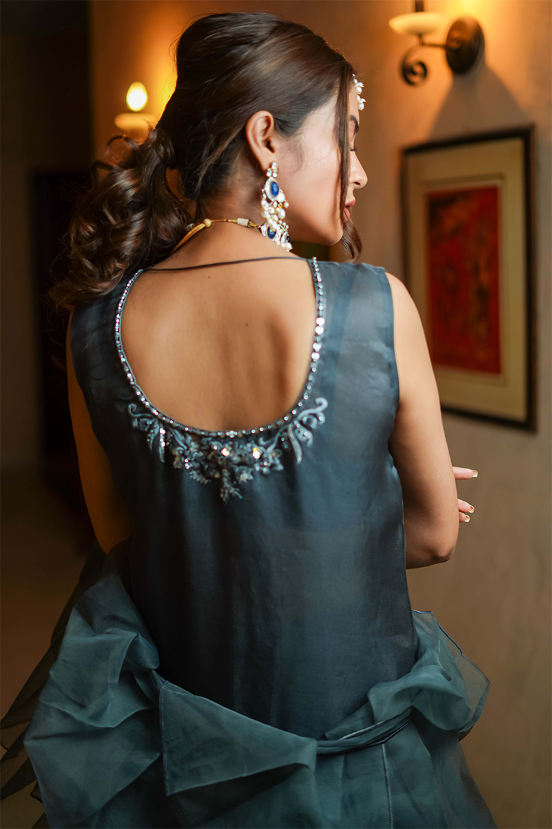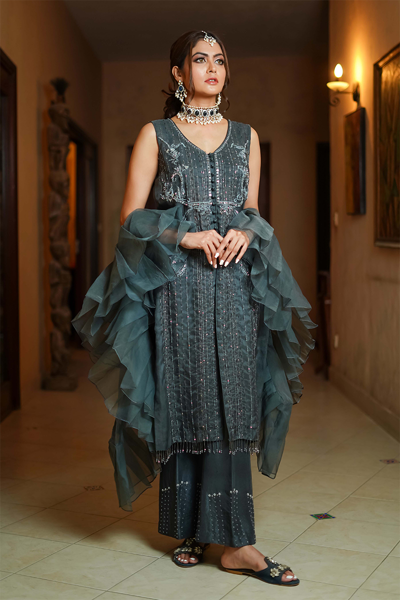 Shirt front fully worked, heavier on neckline thinning out towards hemline. Silver bead and sequin work with 3D motifs. Model shirt length is 44 inches. Sleeves with work can be added on request. Trousers have work detailing. Organza dupatta with frill.