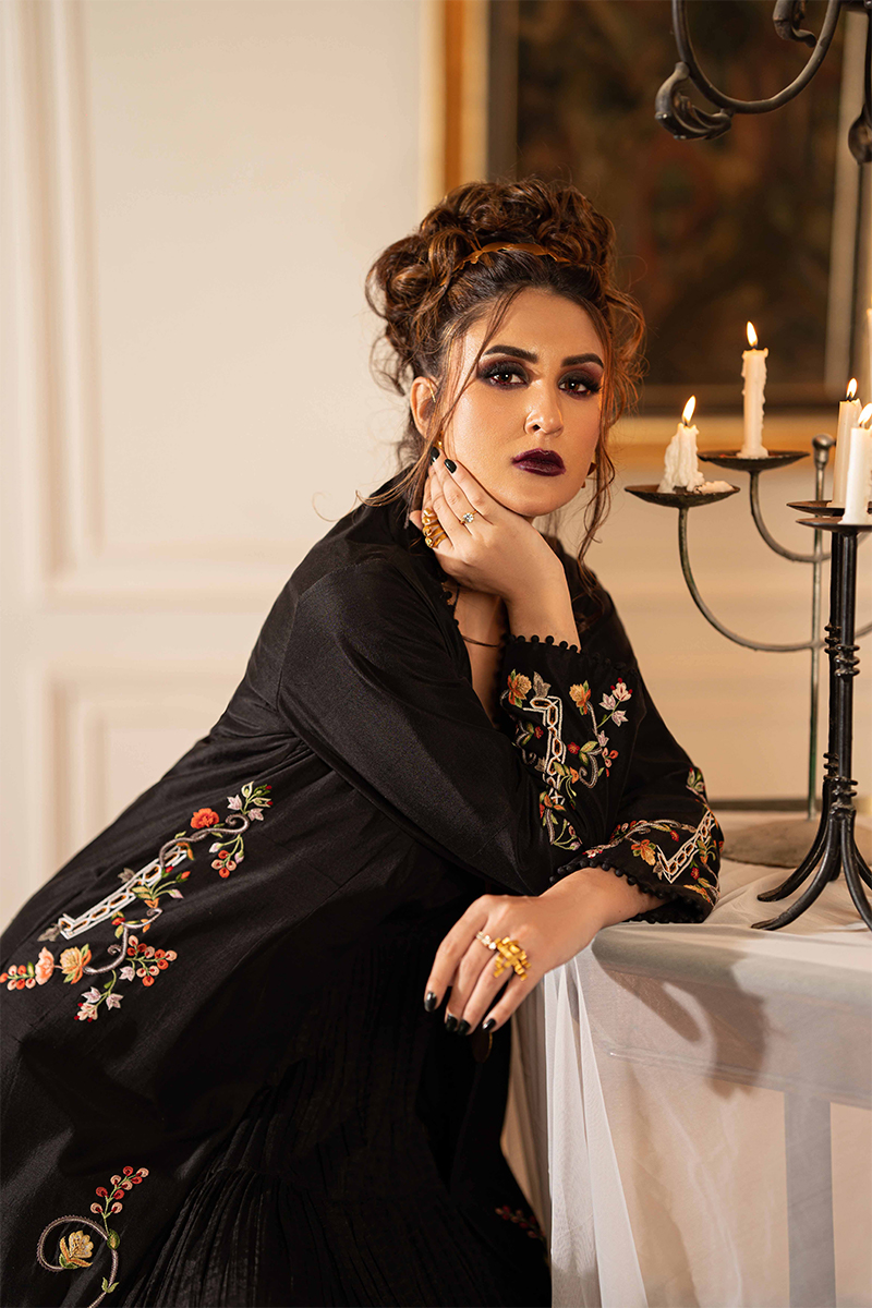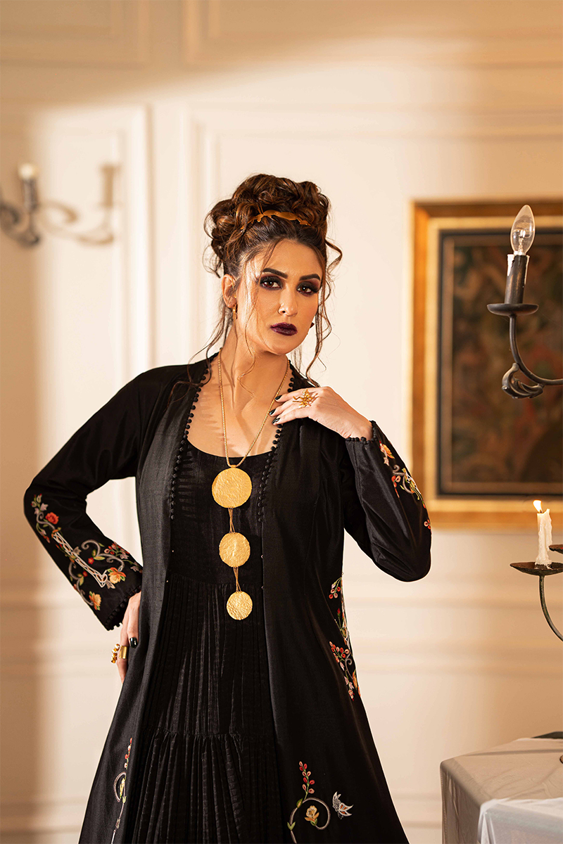 The centerpiece is a black silk jacket, a luxurious creation with hand embroidery that blends intricate eastern artistry with modern sophistication. The embroidery, featuring a delicate mix of vibrant colors inspired by traditional designs, enhances the jacket’s charm. Its eastern embroidery , combined with a sharp and structured silhouette, bridges the gap between tradition and contemporary fashion, making it versatile yet bold.