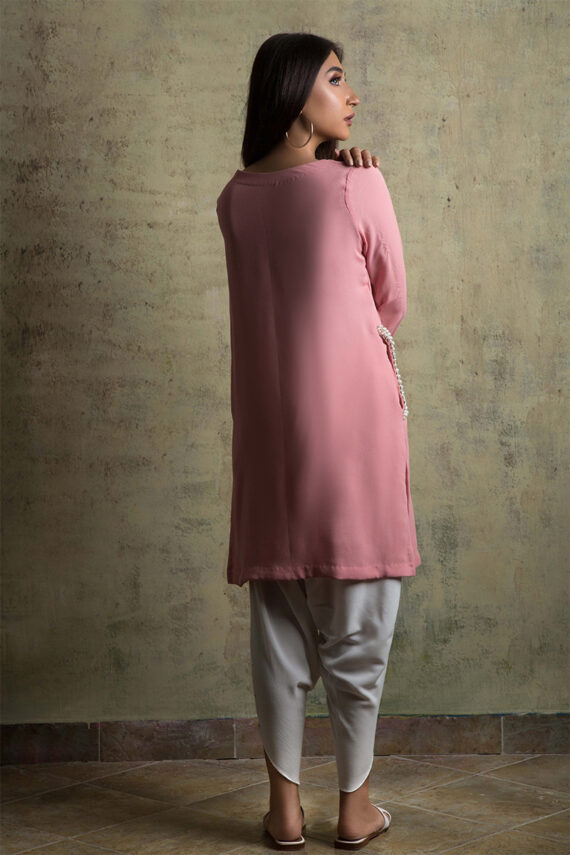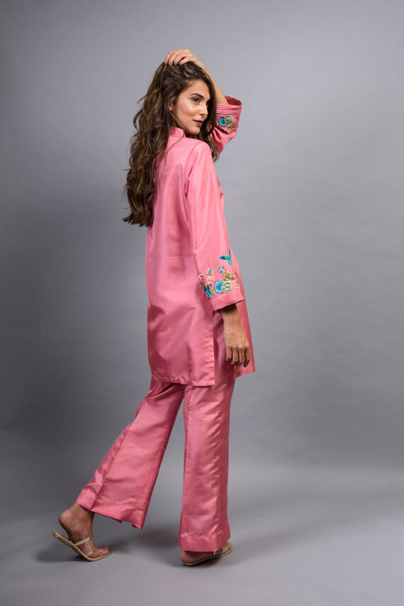 Rose pink silk Kurta fully worked in resham hand embroidery. Paired with pure silk trousers.