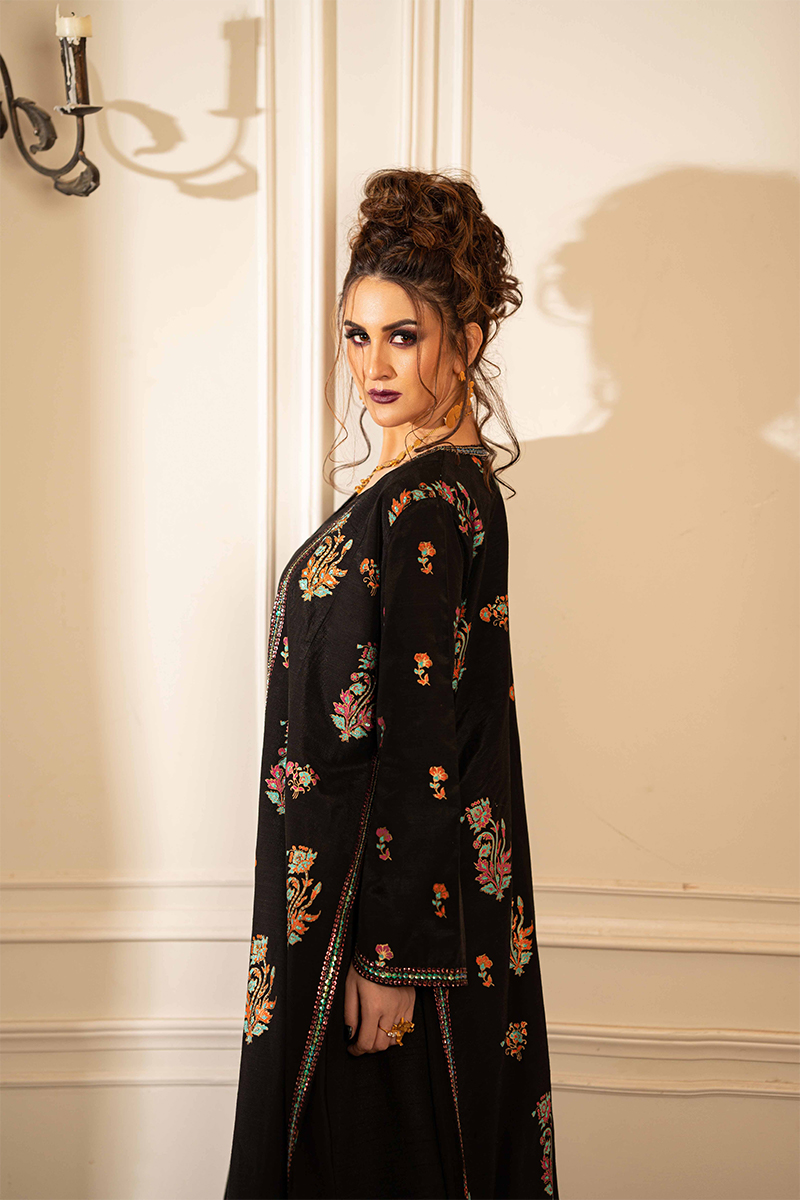 The ensemble features a black silk jacket that exudes a blend of elegance and artistry. The jacket showcases block print in vibrant fuchsia, aqua, and gold, with the intricate patterns creating a dynamic and luxurious effect. To elevate the design further, subtle embellishments of sequin in the same color palette are tastefully scattered, adding a delicate shimmer without overwhelming the look.