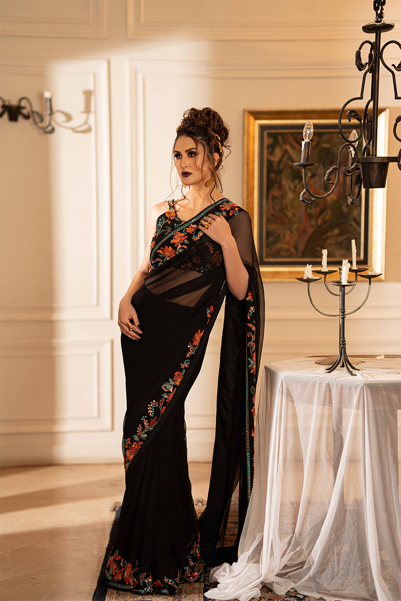 A timeless black chiffon saree exudes sophistication and grace, perfect for December’s formal events. The sheer elegance of the fabric allows for a flowing silhouette that complements every movement. Delicately adorned with intricate hand-embellished 3D sequin work, the saree showcases a mesmerizing interplay of aqua and coral hues. These contrasting sequins shimmer brilliantly against the black backdrop, creating a striking, eye-catching effect.