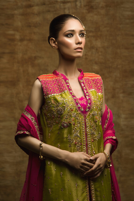 Ideal for Mehndi or Mayoun event delicate gota work on jacket. Sleeves can be added on request in the jacket. Dupatta has star burst sprinkle and finished with gota edging. Model is wearing 48 inches length shirt and 42 inches gharara. Fabric is Pakistani silk and net dupatta. Matching groom’s outfit can be ordered.