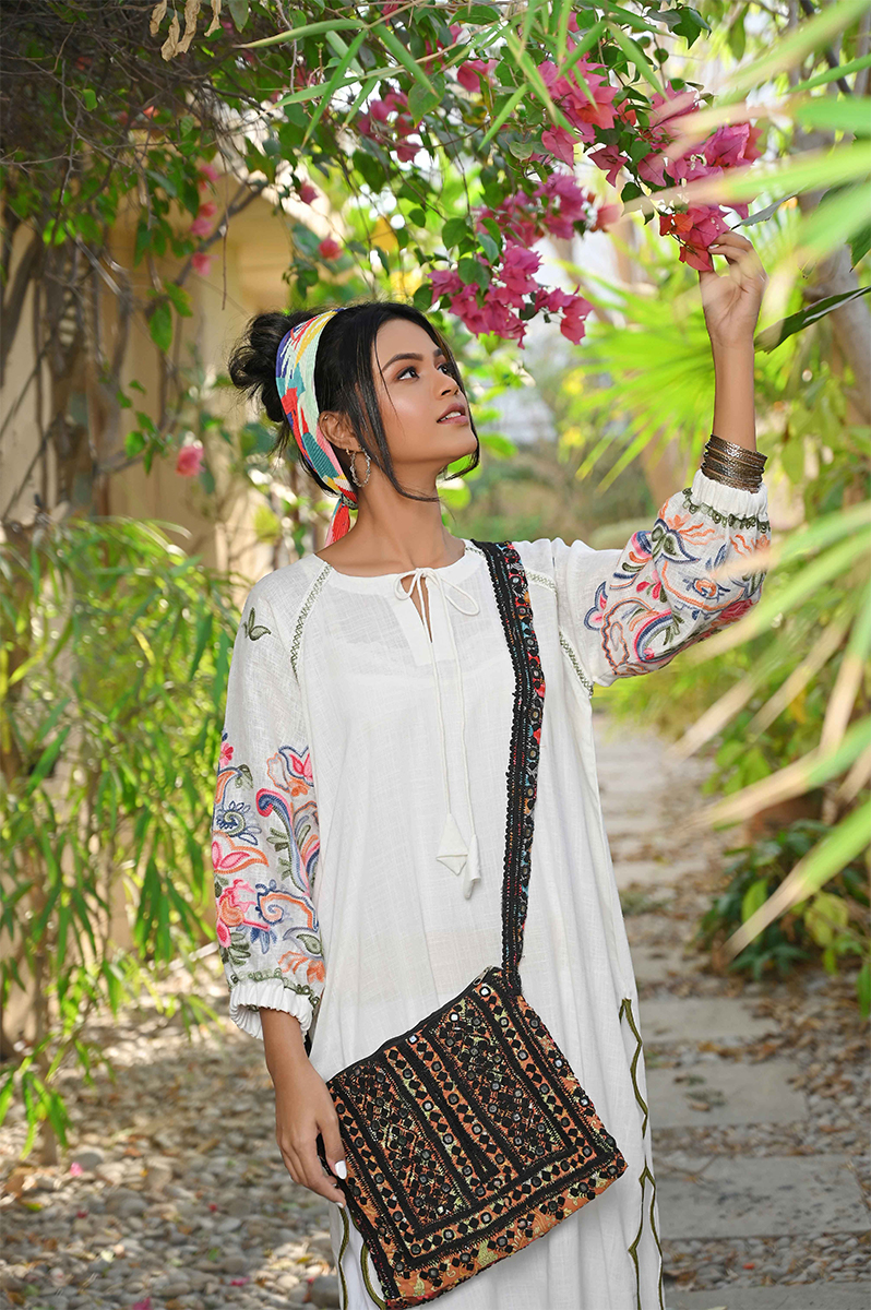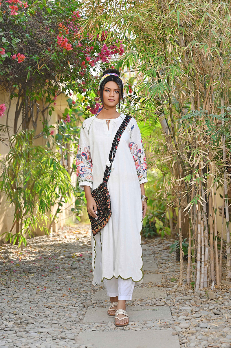 A straight long shirt featuring full Kashmiri embroidery on sleeves, and elegant cutwork detailing along the slits. Paired with tapered trousers. This look is perfect for morning school run or office.