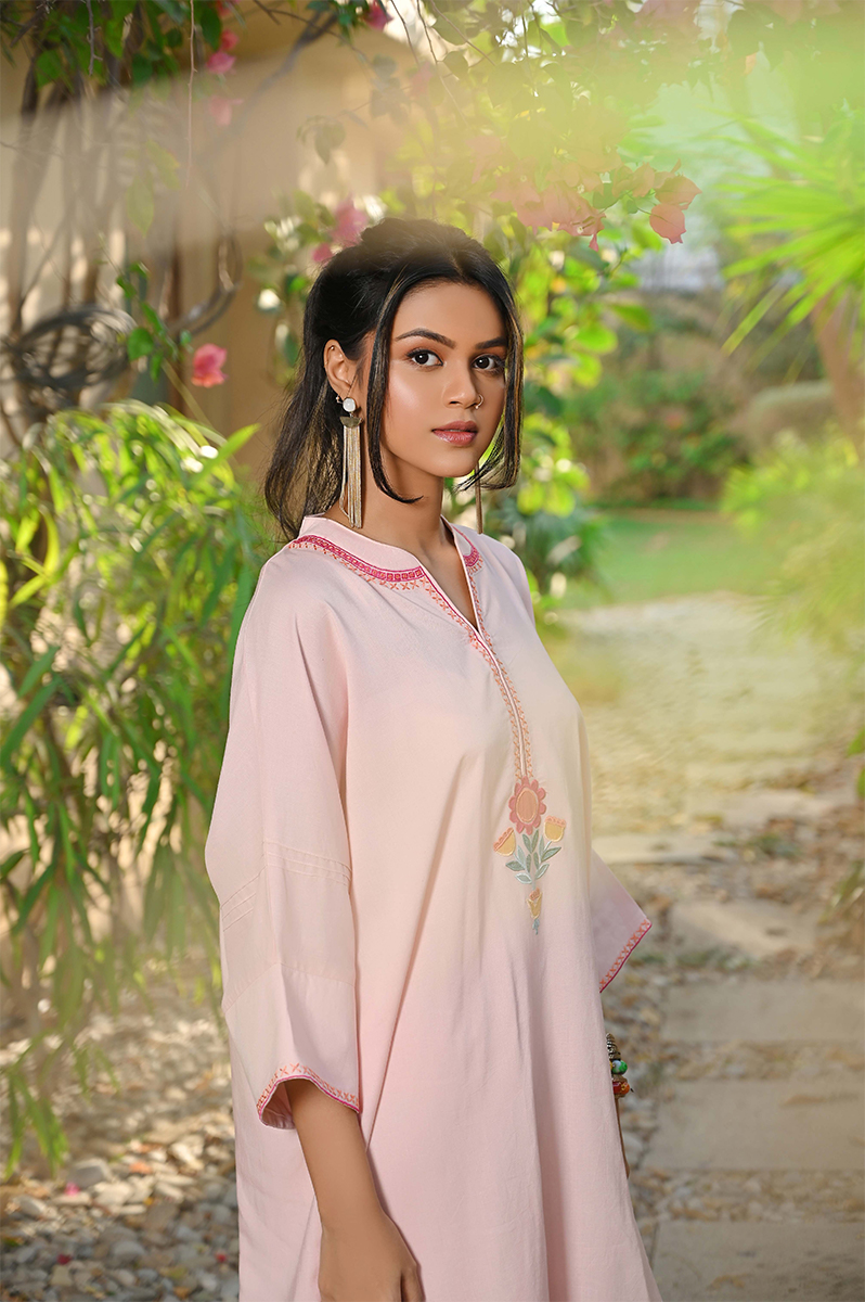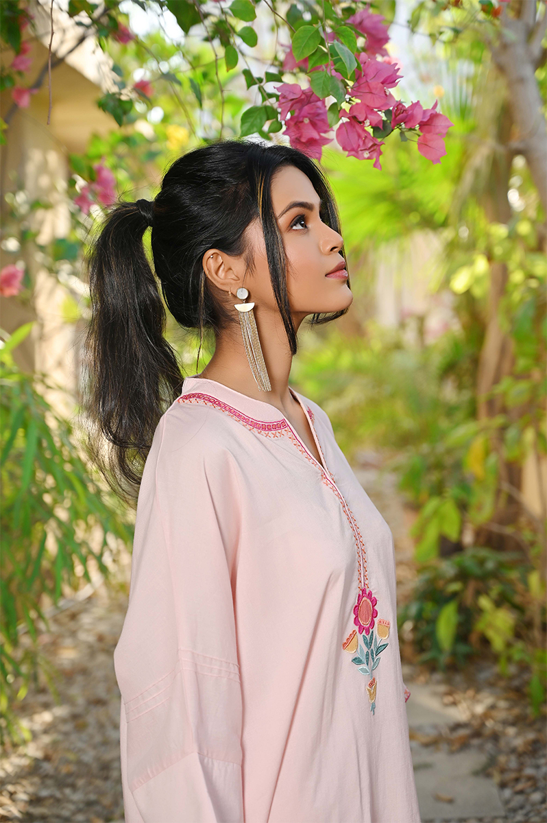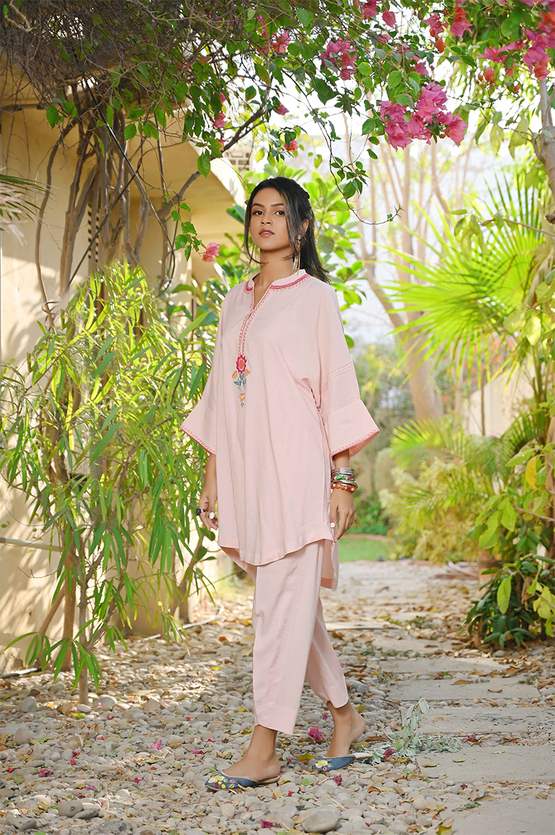 A short shirt featuring an appliqué motif in front, embroidery detailing along the neckline, paired with tailored shalwar . The look is perfect for your morning school run or office.
