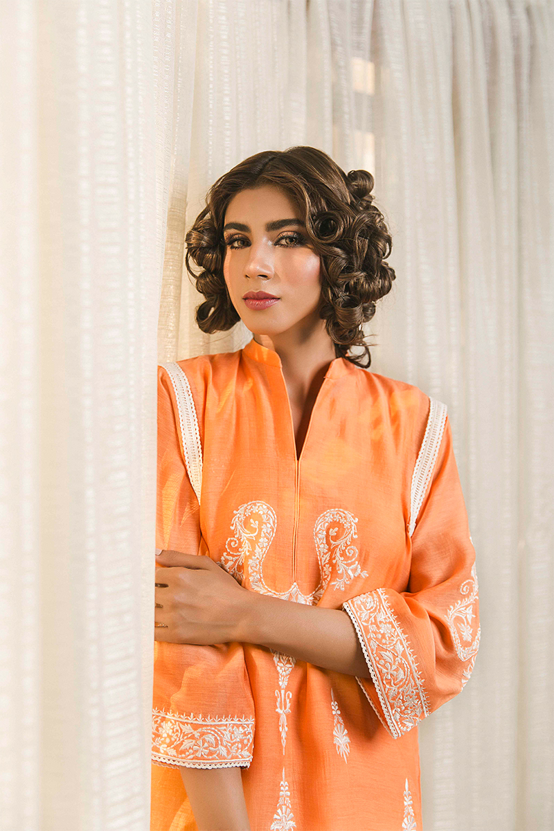Orange with delicate embroidery on neckline, back, sleeves, front and back hemline.